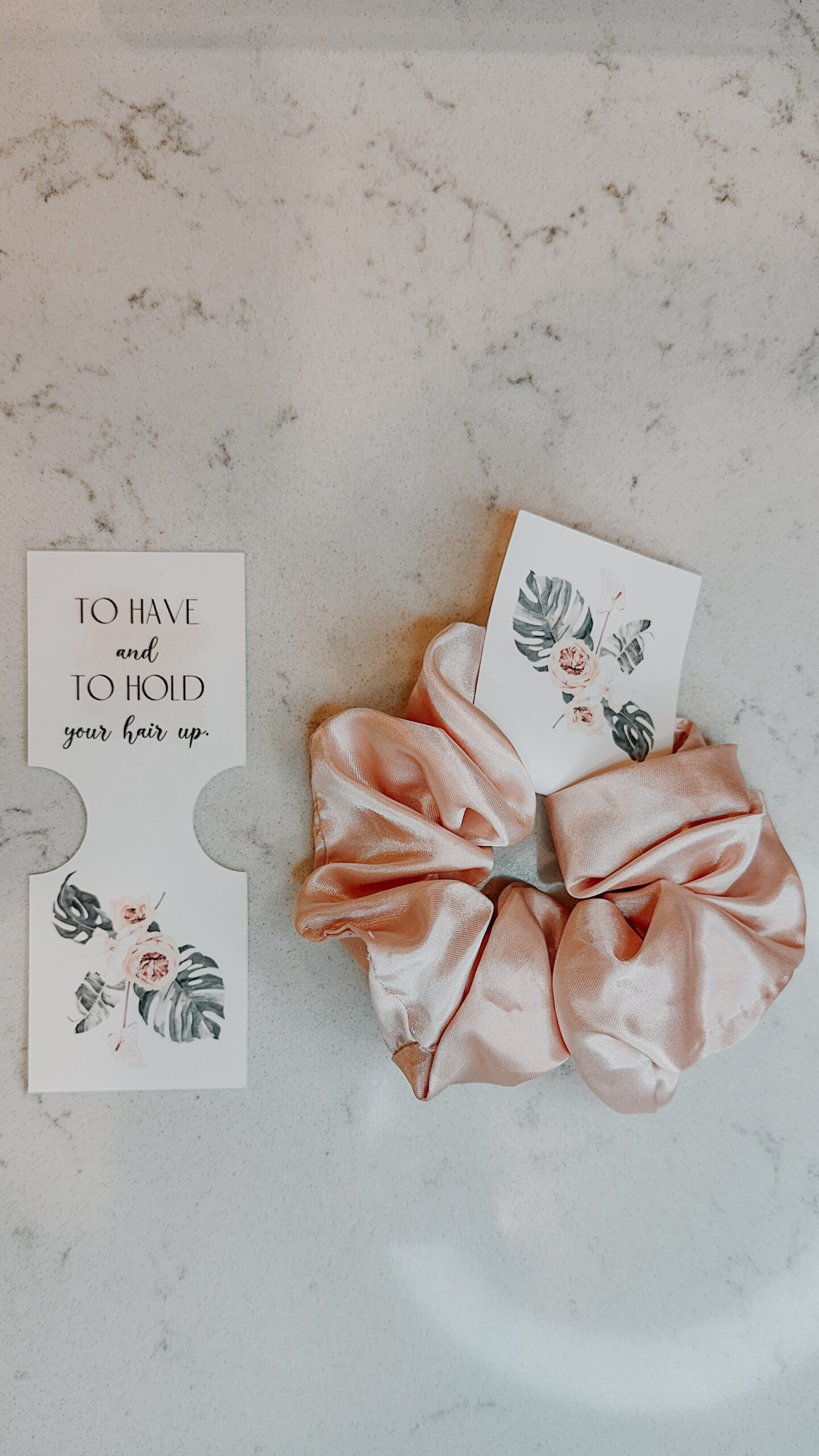 For all my DIY brides who enjoy creating by hand, here is a super easy-to-make scrunchie tag for your Bridesmaid box.
